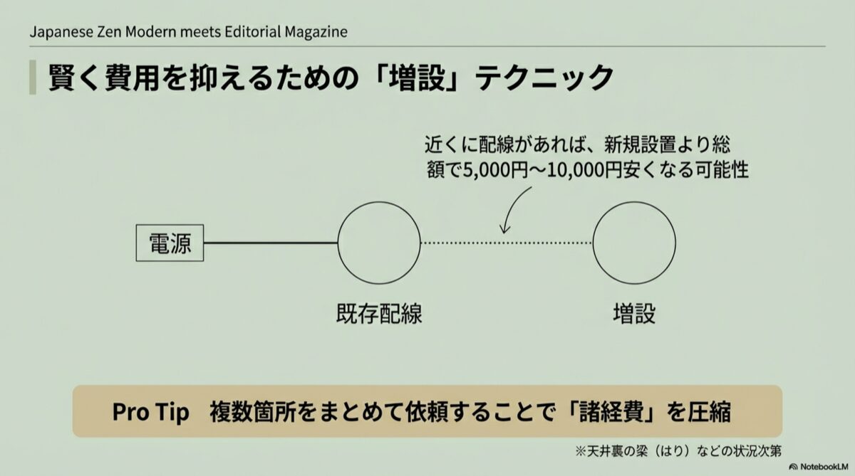 具体的には、分電盤から新たに線を引いてくる大掛かりな配線工事が不要になる分、総額で5,000円から10,000円ほど安くなるイメージを持っておくと良いかもしれません。ただし、これも「天井裏の状況次第」というのが正直なところです。