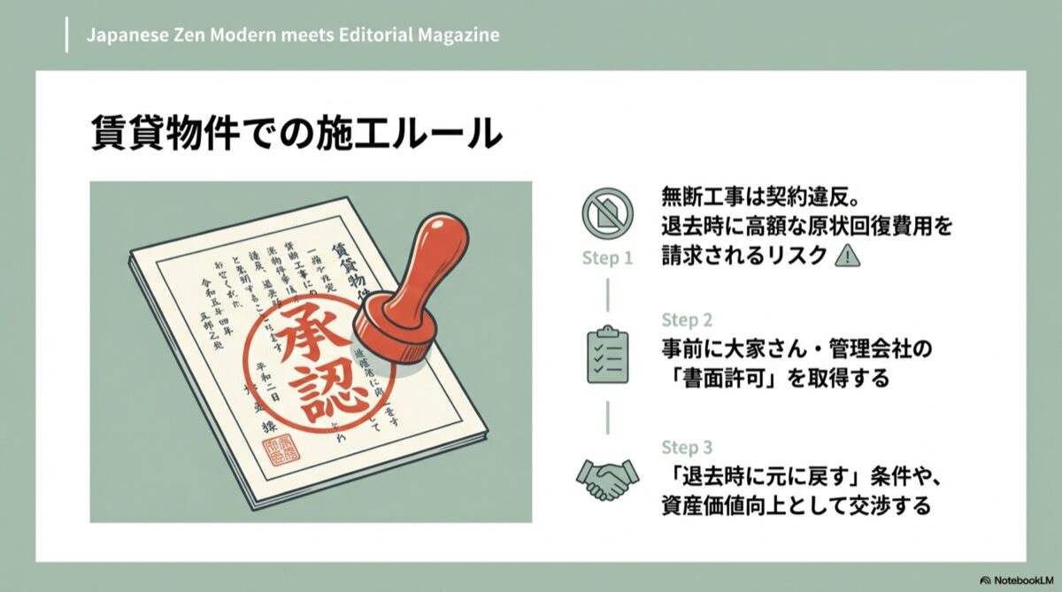 ほとんどの賃貸契約では、このような建物の現状を変更する行為は禁止されており、無断で行った場合、重大な契約違反とみなされます。