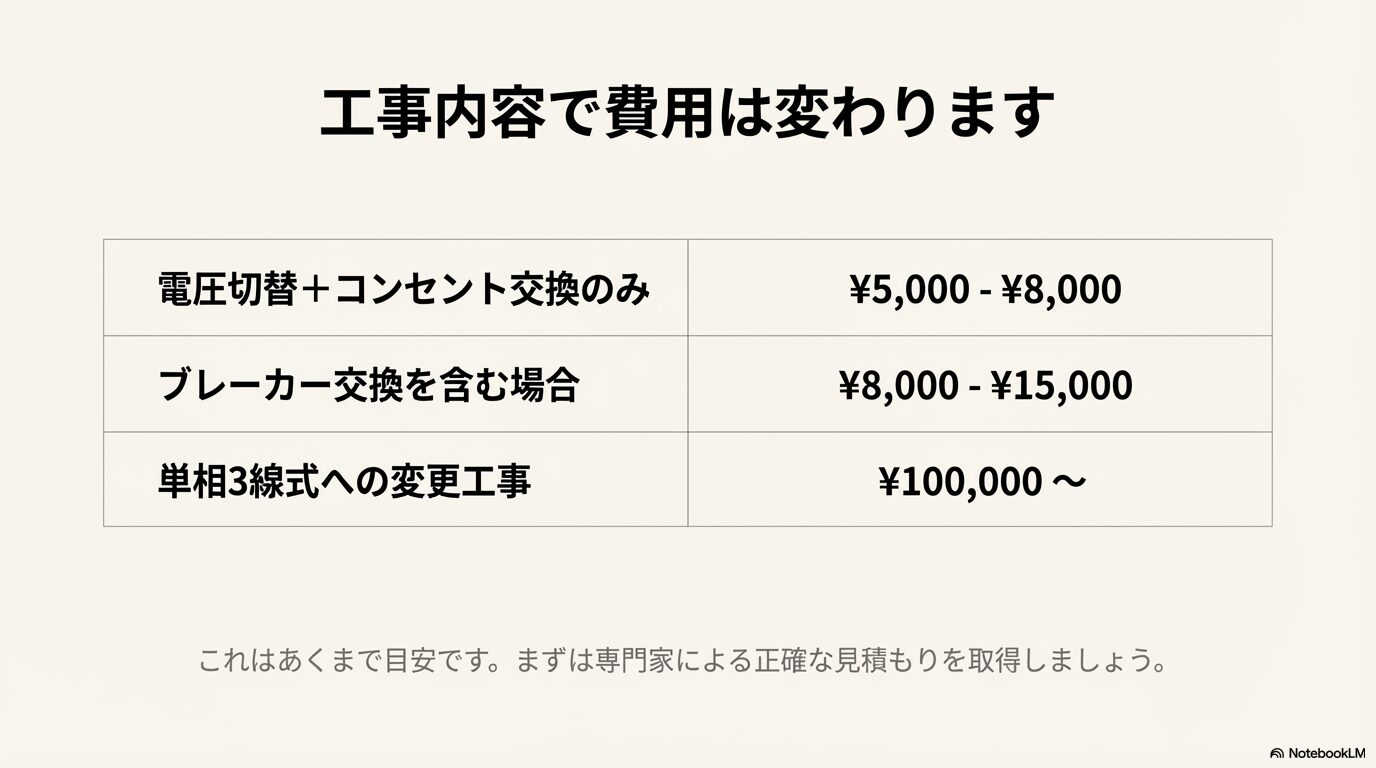 「専門業者に依頼する場合、具体的な費用はどれくらいかかるの?」といった相場や、失敗しない業者の選び方については、以下の『200V・100V変換工事の費用は?相場と業者選びを解説』の記事で詳しく紹介していますので、あわせてご覧ください。