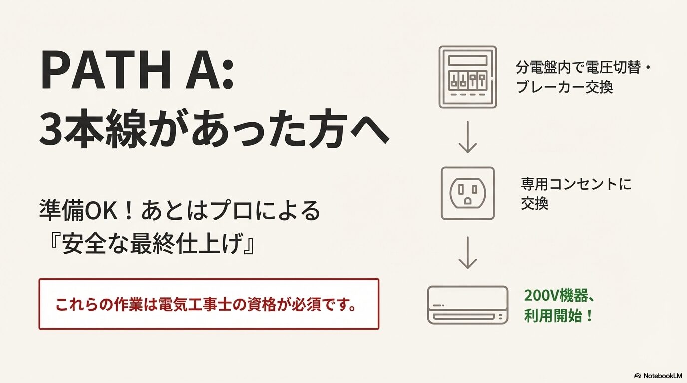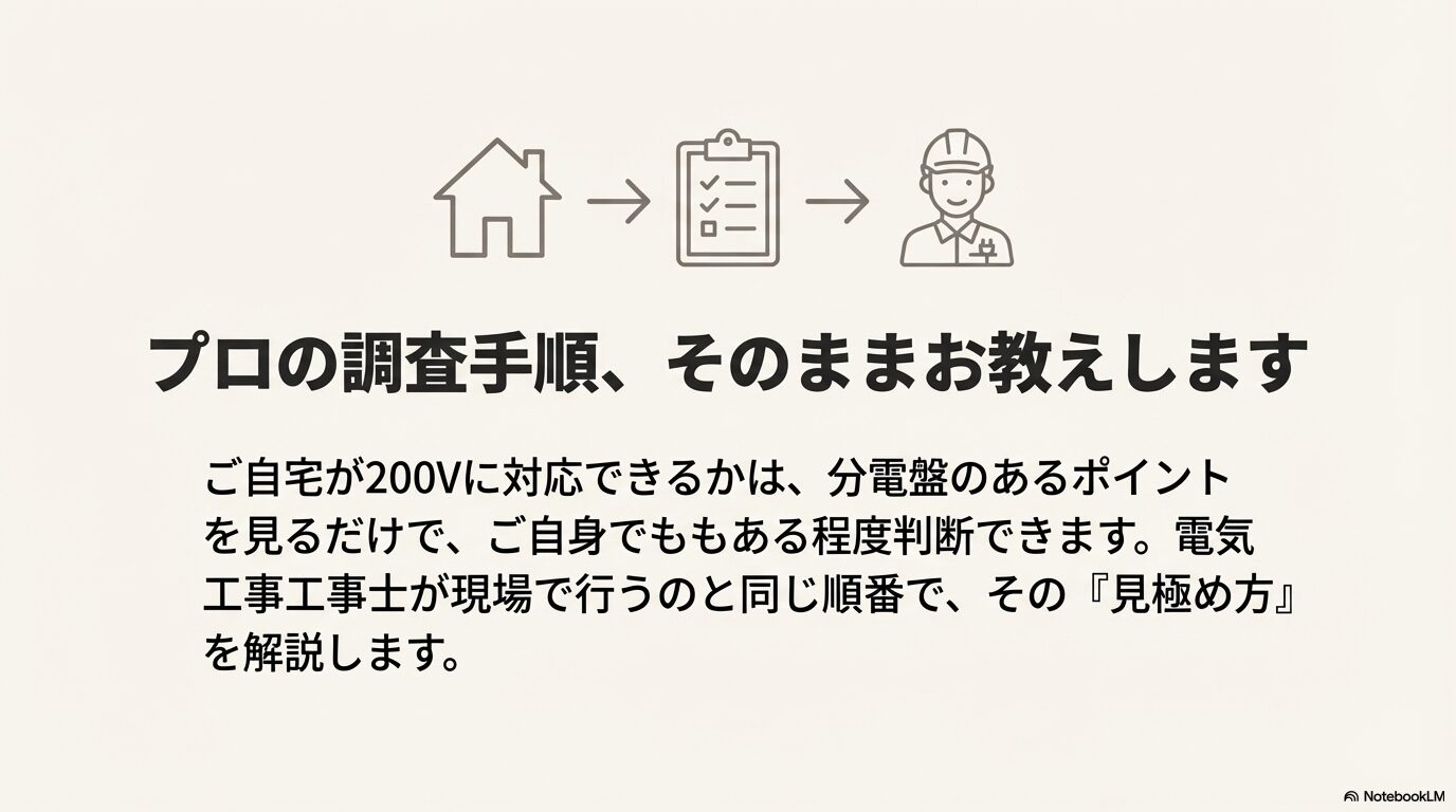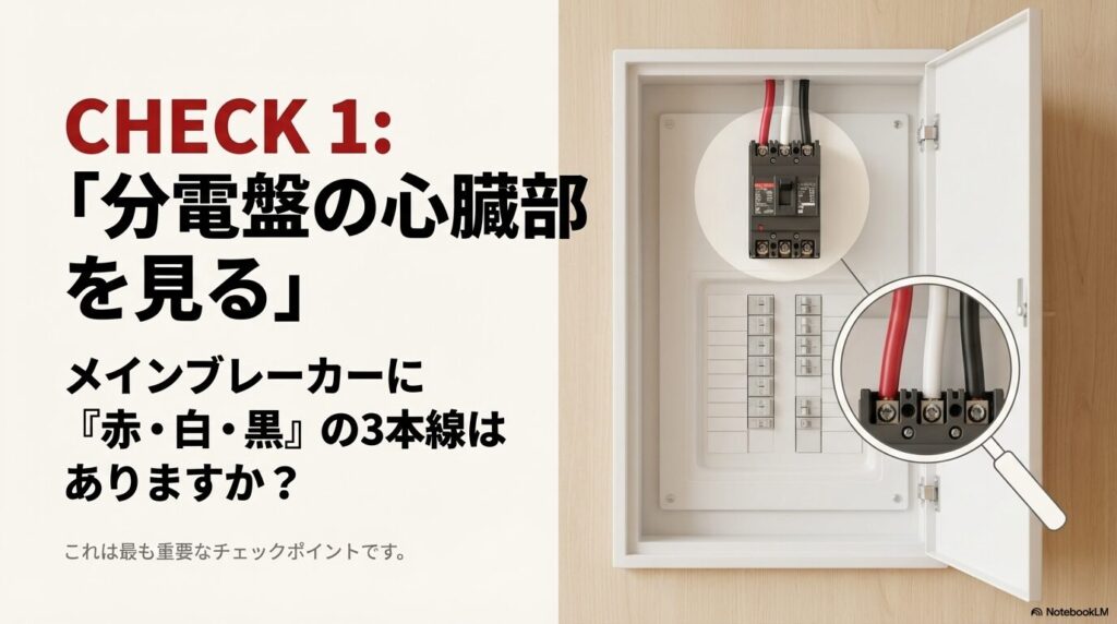 要点を改めて整理すると、まずはご自宅の「主幹ブレーカー周辺に赤・白・黒の3本線が入っているか」を確認するのが全てのスタートラインです。 これさえクリアしていれば、あなたのご自宅は「200V対応住宅」としてのポテンシャルを持っています。