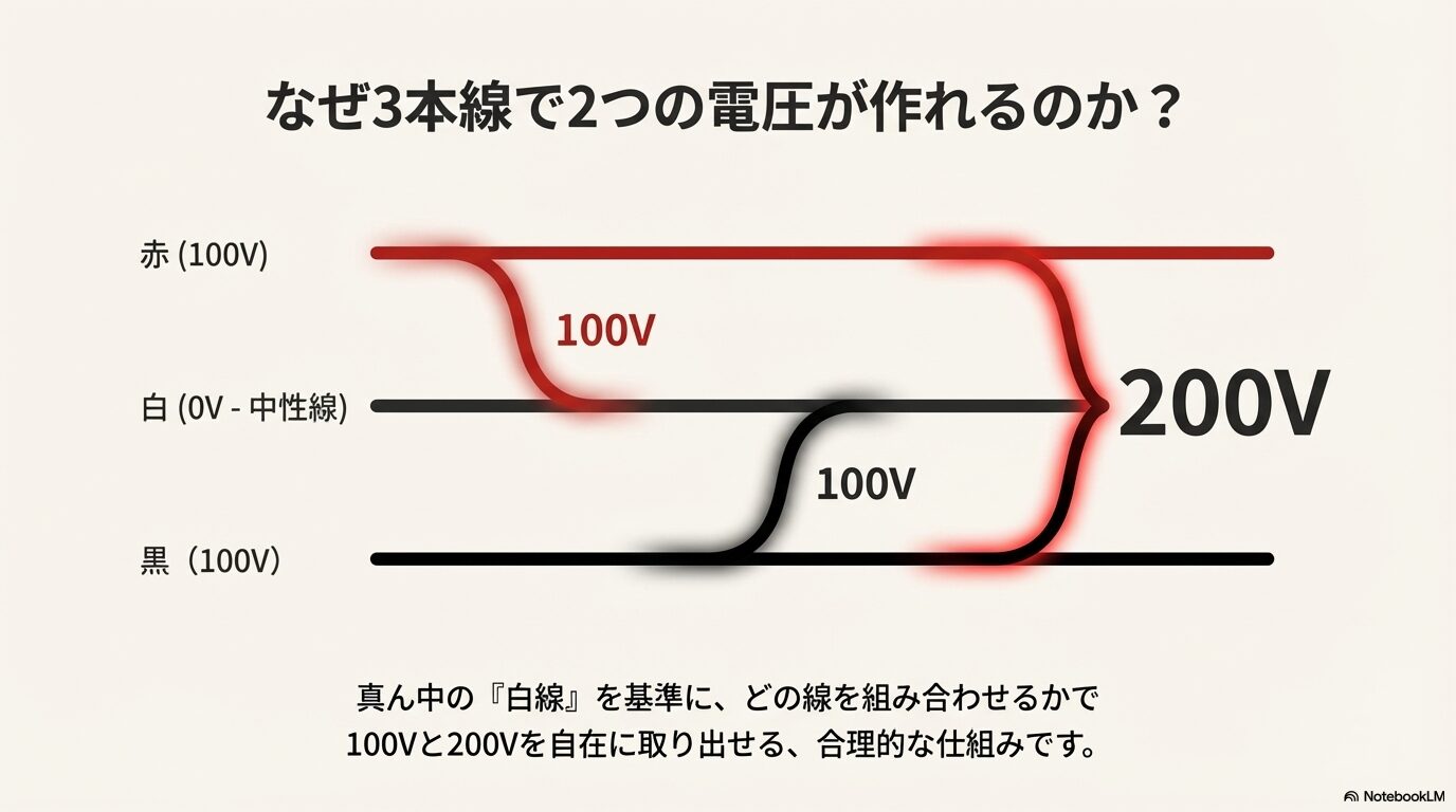 少し専門的な話になりますが、「単相3線式」は非常に合理的な仕組みになっています。真ん中の「白線(中性線)」を基準(0V)として、上下の「赤線」と「黒線」にはそれぞれ100Vの電圧がかかっています。
