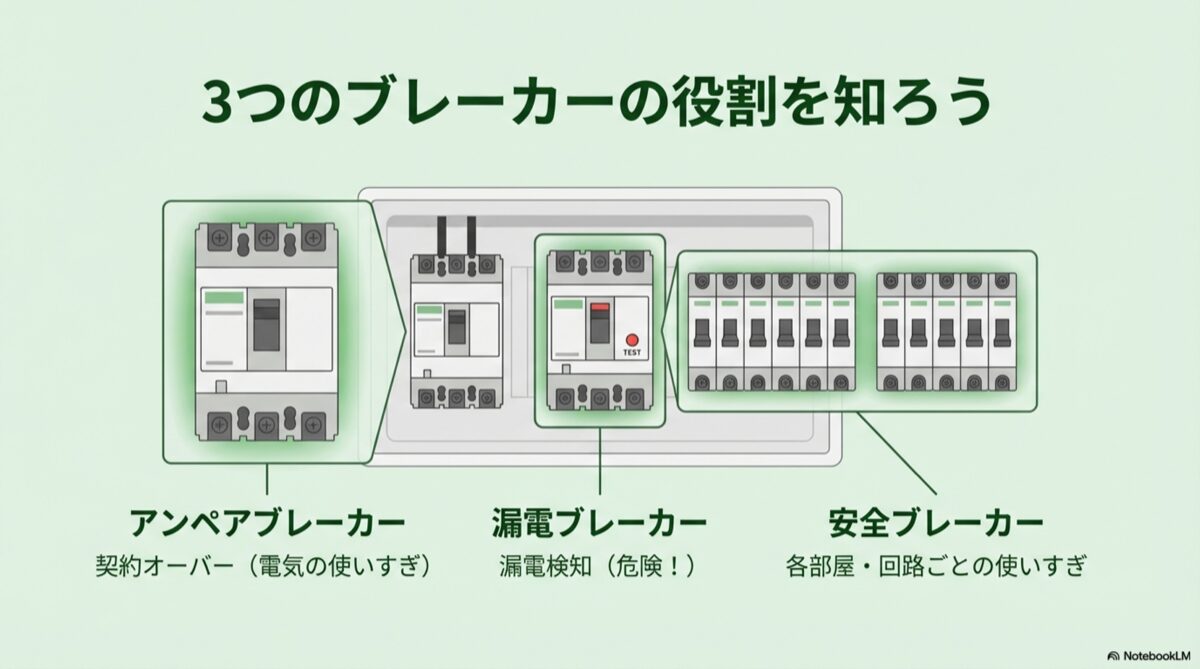分電盤のカバーを開けると、スイッチのようなものがいくつか並んでいますよね。これらはすべて「ブレーカー(遮断器)」ですが、実はそれぞれに異なる役割があります。