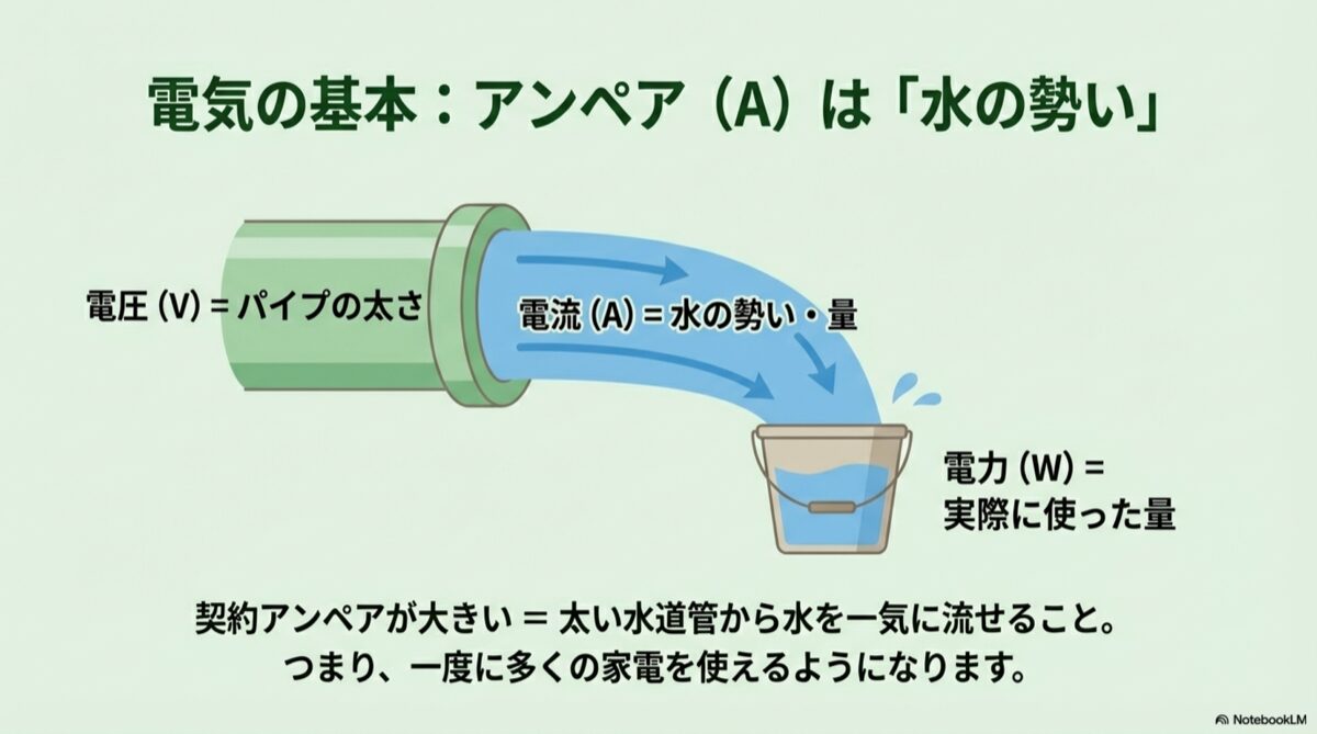 でも、基本さえ押さえれば大丈夫です。ごく簡単に言うと、アンペア(A)とは「一度に流すことができる電気の量(電流の大きさ)」のことです。