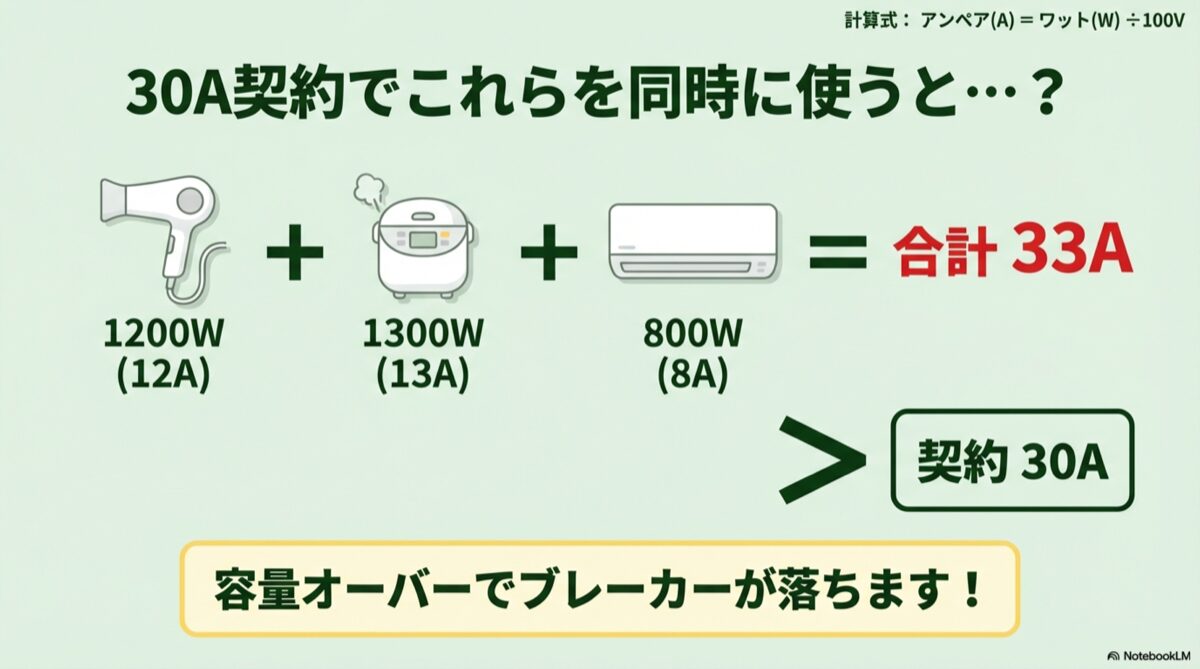 もしご家庭の契約が30Aだった場合、朝の支度でドライヤー(12A)と炊飯器(13A)とエアコン(8A)を同時に使ったらどうなるでしょう?合計は 12 + 13 + 8 = 33A となり、契約の30Aを超えてしまうため、アンペアブレーカーが落ちてしまう、という計算になります。