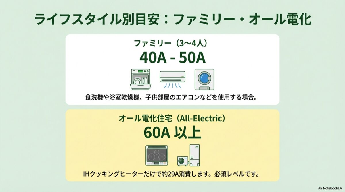- 一人暮らし〜大家族・オール電化まで最適なアンペア数の目安