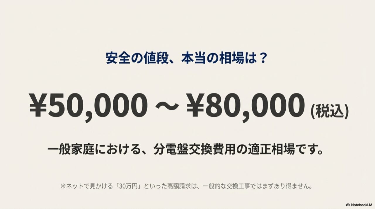 一般家庭における分電盤交換費用の適正相場は5万円から8万円であり、30万円等の高額請求は一般的ではないことを示す画像