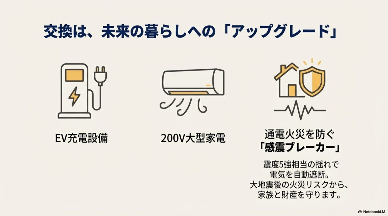 EV充電設備対応や通電火災を防ぐ感震ブレーカーなど、交換によって得られる未来の暮らしへのアップグレード機能