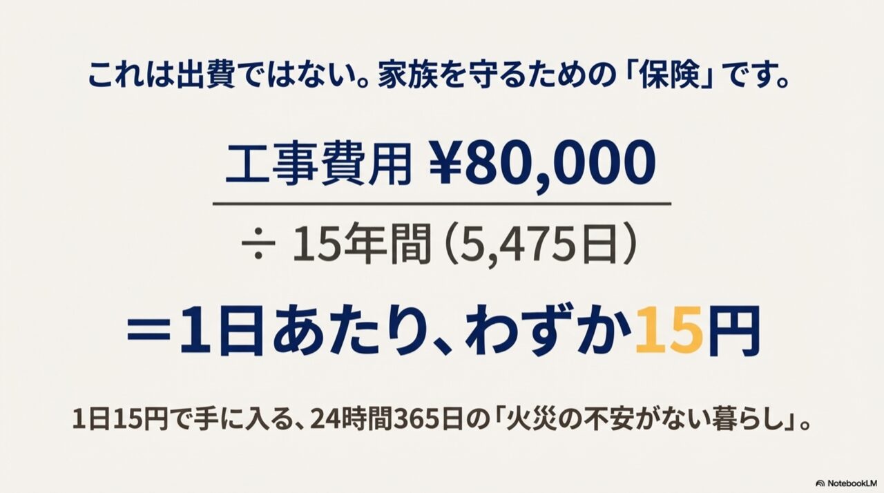 工事費用を15年で日割り計算すると1日わずか15円になり、家族を守る保険として安価であることを示す画像