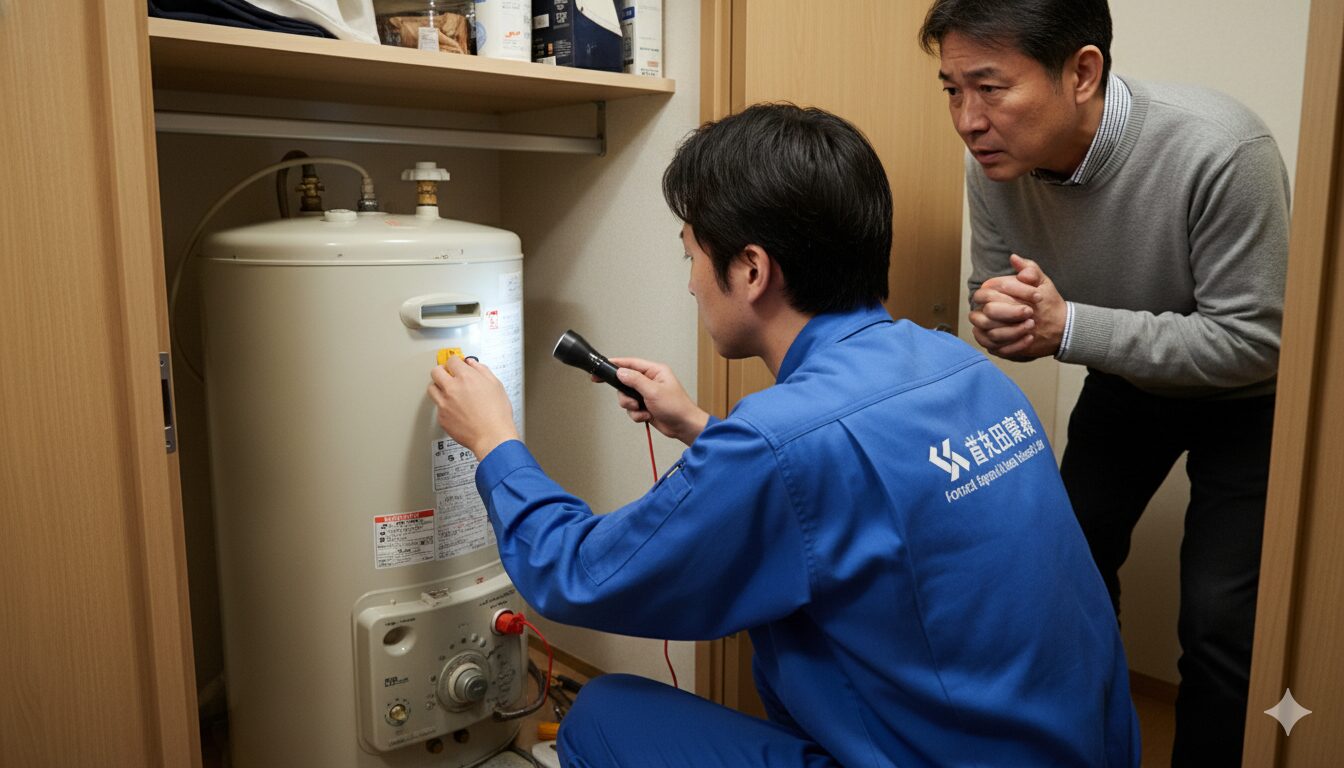 - 機器の故障:電熱ヒーター、温度センサー、減圧弁といった内部部品の故障。これは私たち専門業者の出番ですね。