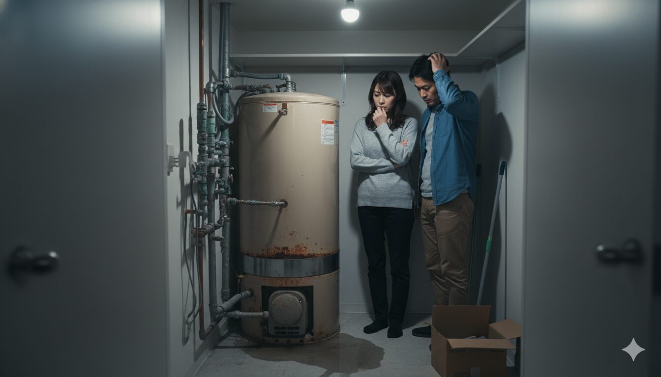 古いマンションだと、電気温水器が廊下や洗面所の収納スペースに「室内置き」されていることも珍しくないですよね。
