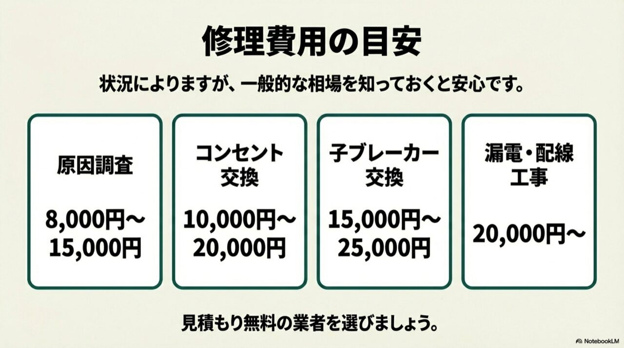 専門業者に依頼するとなると、やはり気になるのは「一体いくらかかるんだろう?」という費用面ですよね。電気工事の料金は、停電の原因、修理に必要な作業内容、交換する部品の種類などによって大きく変動するため、一概に「いくらです」と断言するのは難しいのが正直なところです。