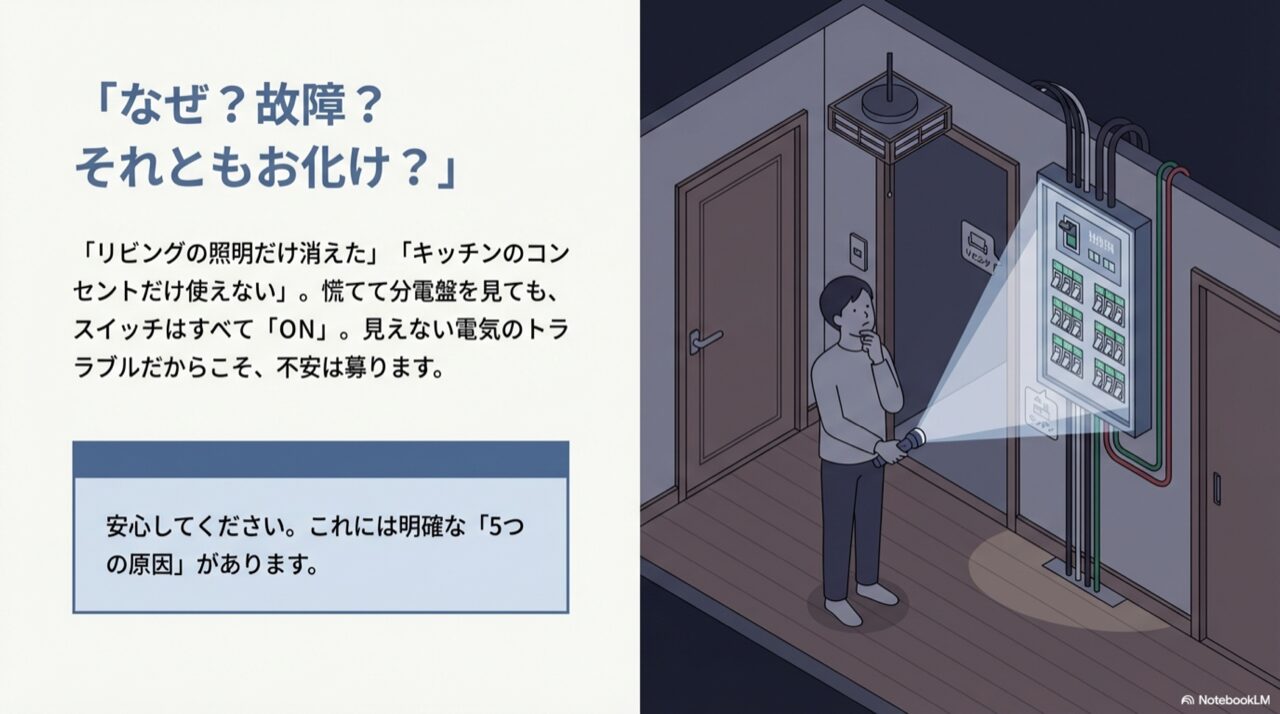 この記事では、そんな「ブレーカーが落ちていないのに、家の一部だけが停電する」という、一見すると不可解なトラブルの謎を解き明かしていきます。