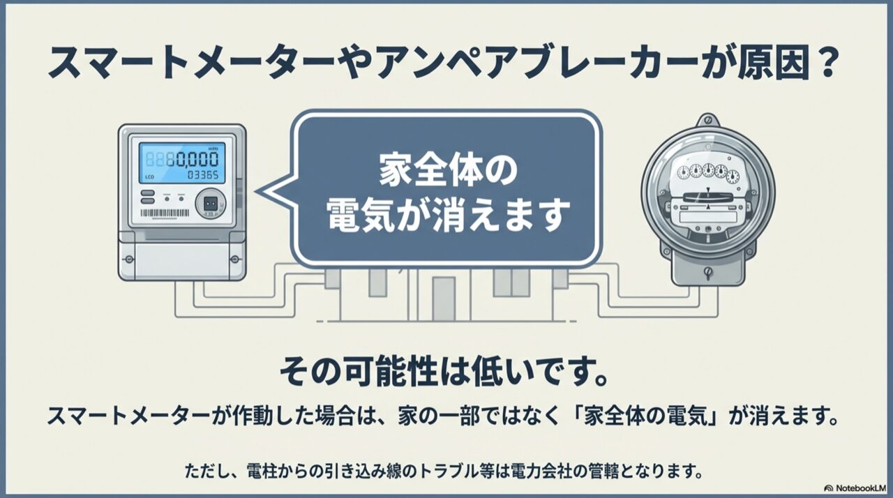 ただ、このアンペアブレーカーが落ちた場合は、家全体の電気がすべて消えます。そのため、「家の一部だけ停電」という今回のケースの直接的な原因である可能性は低いでしょう。