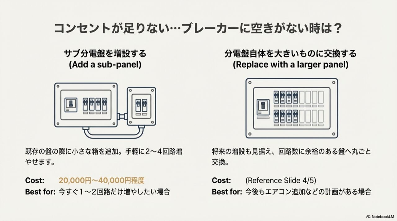 既存の盤の横にサブ盤を追加する方法と、大きな盤へ丸ごと交換する方法の比較イラスト
