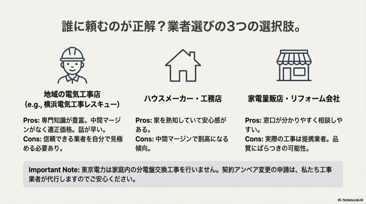分電盤は文字通り、ご家庭の電気系統の司令塔。万が一のことがあれば、火災などの重大な事故にもつながりかねません。だからこそ、業者選びは価格以上に慎重に行う必要があります。
