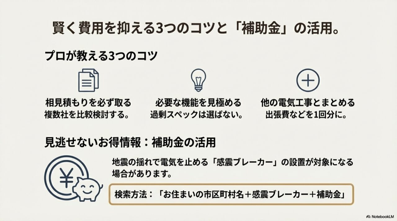 ご家族の安全を守るための重要な工事とはいえ、やはり費用はできるだけ抑えたいというのが皆様の本音だと思います。ここでは、少しでも賢く、そしてお得に分電盤を交換するための実践的なポイントをいくつかご紹介します。