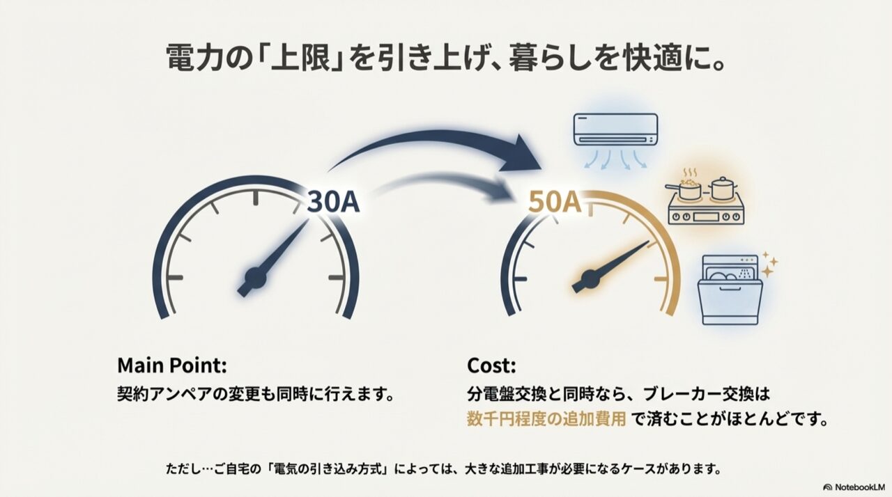 このアンペア変更に伴う分電盤内のブレーカー交換作業自体は、分電盤の全交換と同時に行えば、部品代と少しの手間賃として数千円程度の追加費用で済むことがほとんどです。
