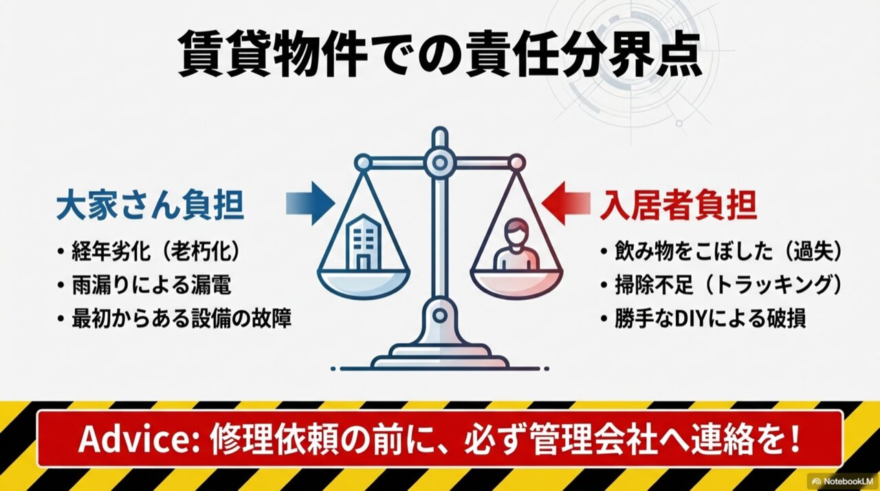 原則は「経年劣化・通常損耗は貸主」「故意・過失は借主」で判断