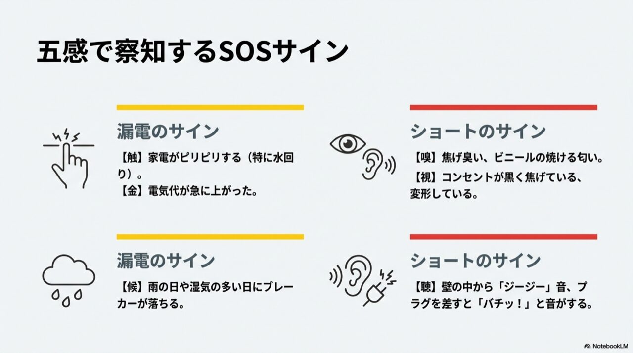 「家電がビリビリする」「焦げ臭い」「異音がする」といったサインは、事故発生のカウントダウンです。決して放置せず、直ちに使用を中止してください。 - やってはいけないこと