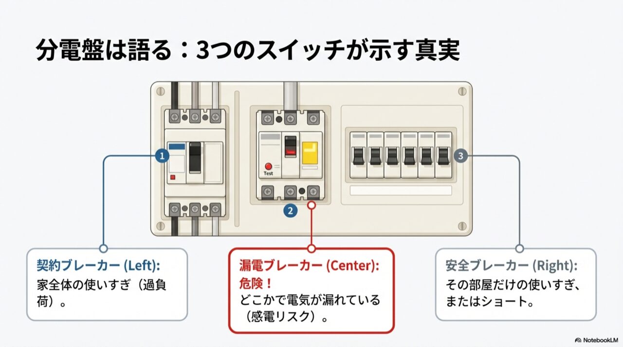電気が消えたら、まずは分電盤を確認しましょう。どのブレーカー(漏電・安全・契約)が落ちているかで、原因を冷静に見極めることができます。 - 危険な前兆サイン