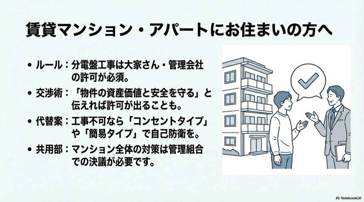 賃貸物件で分電盤工事を行う際は管理会社の許可が必要です。交渉術や、工事不可の場合の代替案についてのイラスト。