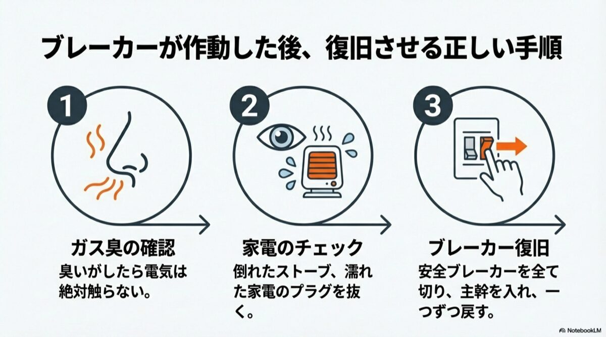 ブレーカーを戻す前の3ステップ。1.ガス臭の確認、2.倒れた家電やプラグのチェック、3.安全ブレーカーから順に復旧させる。
