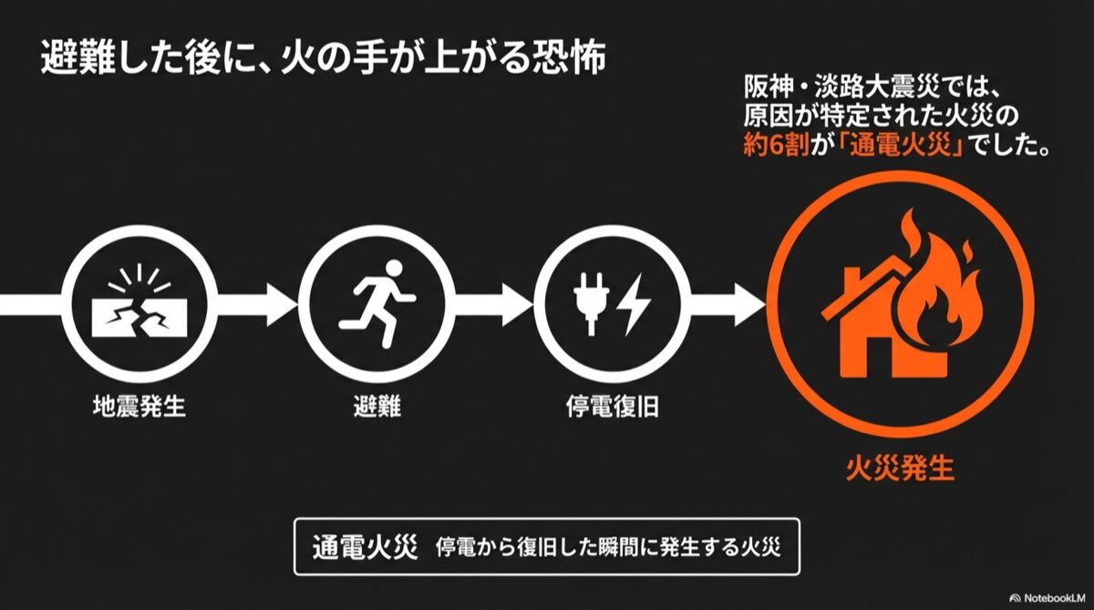 阪神・淡路大震災では火災原因の約6割が通電火災でした。地震発生から避難、停電復旧を経て火災に至る流れの図解。