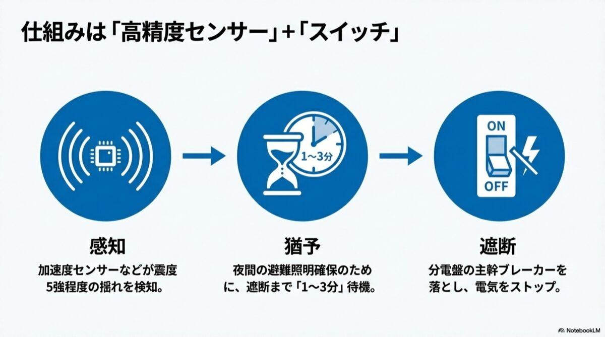 震度5強の揺れをセンサーが検知し、避難照明確保のため1~3分待機した後、主幹ブレーカーを遮断する流れの図解。