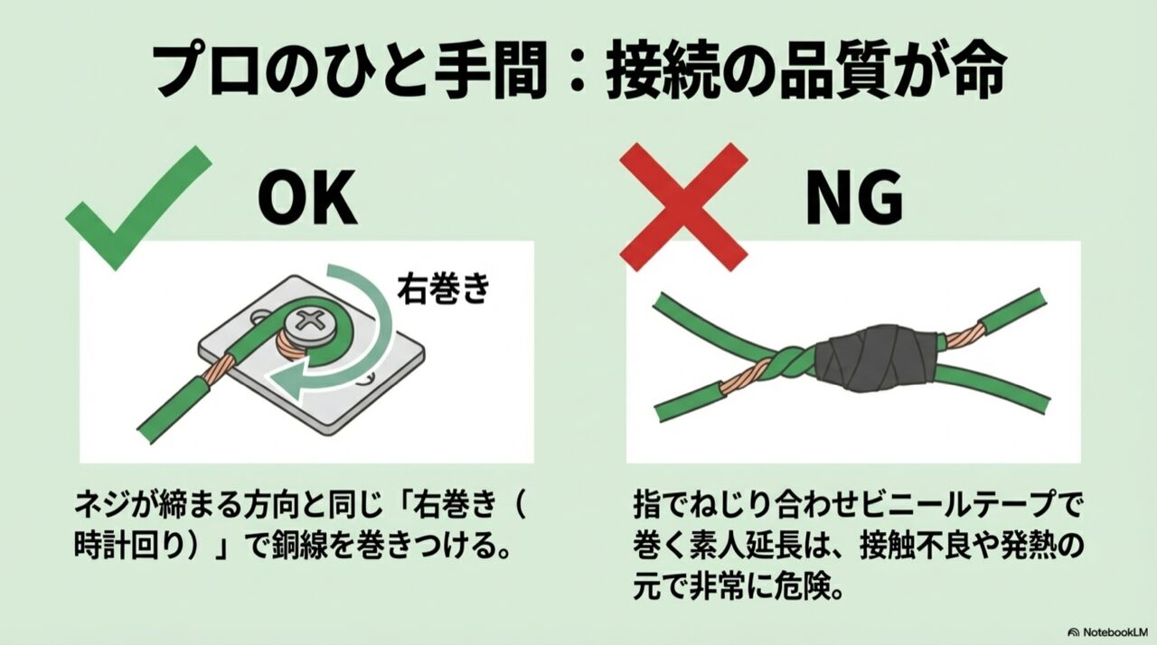 アース線は通常時はほとんど電流が流れませんが、漏電などの異常時には電流が流れるため、接続の確実さが何より重要です。