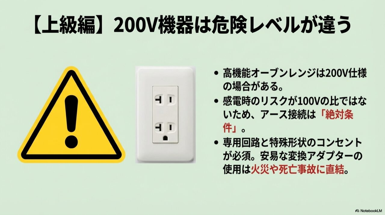 これらの機器を扱う際、アース接続の重要性は一般的な100V家電とは比較にならないほど高まります。