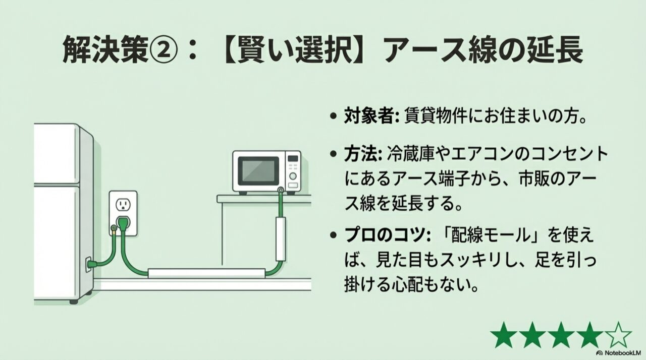 2. 他の場所からアース線を延長★★★★☆中(1,000円〜)賃貸でも実践可能。冷蔵庫やエアコンの端子から線を伸ばす。DIYでも対応可。