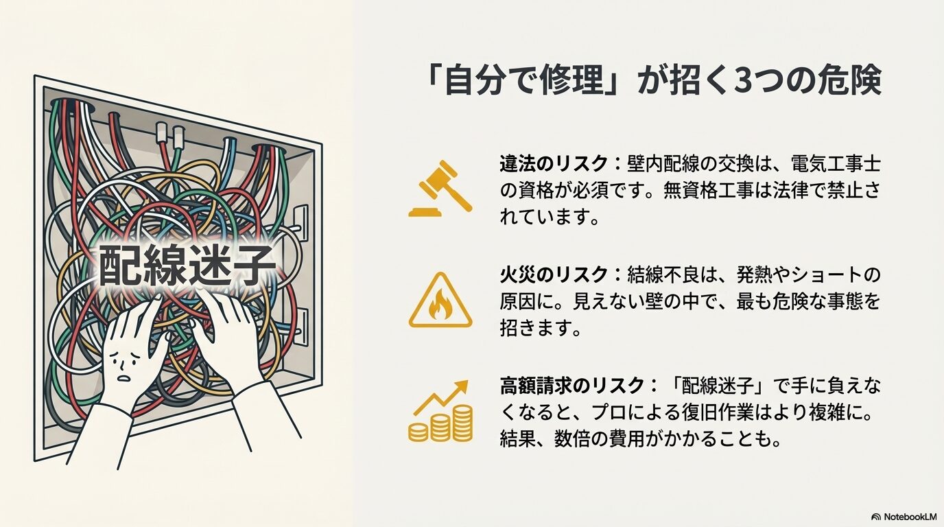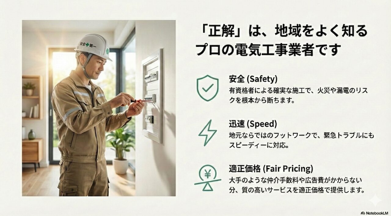 スイッチ修理をどこに頼むか迷った時の最終的な判断基準は、「その数百円〜数千円の節約が、家族の命や財産を賭けるに値するか」という点に尽きます。