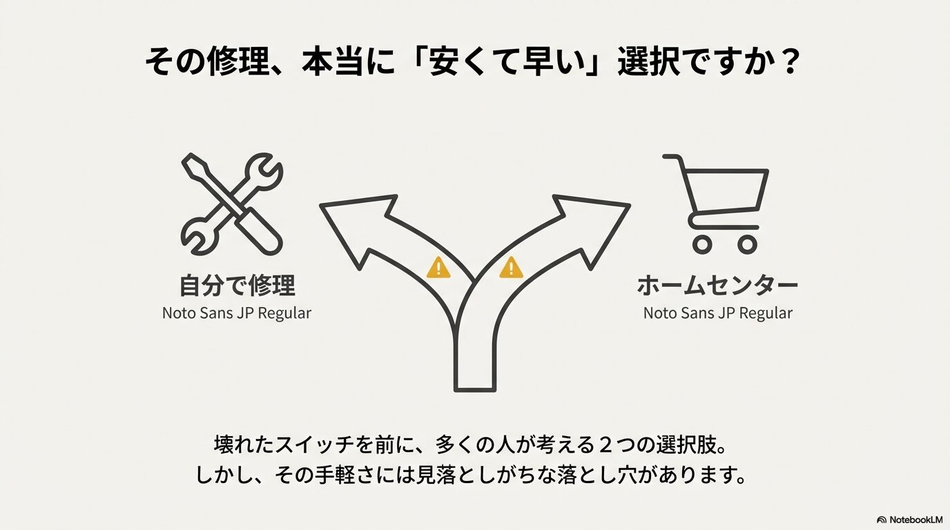 壊れたスイッチを前に、「自分で修理」するか「ホームセンター」に行くか迷っている分岐点のイラスト。