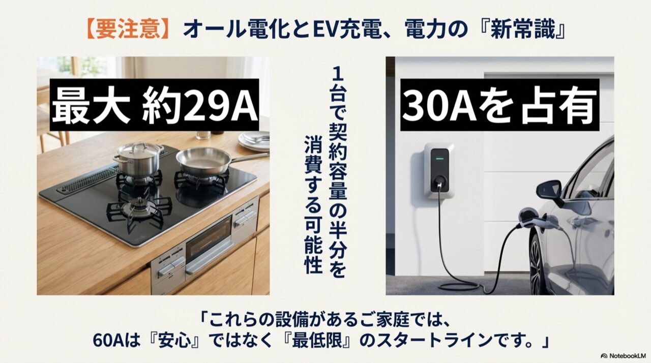 IHクッキングヒーターが最大約29A、EV充電が30Aを占有することを示し、これらがある家庭では60Aが最低ラインになることを警告する図。