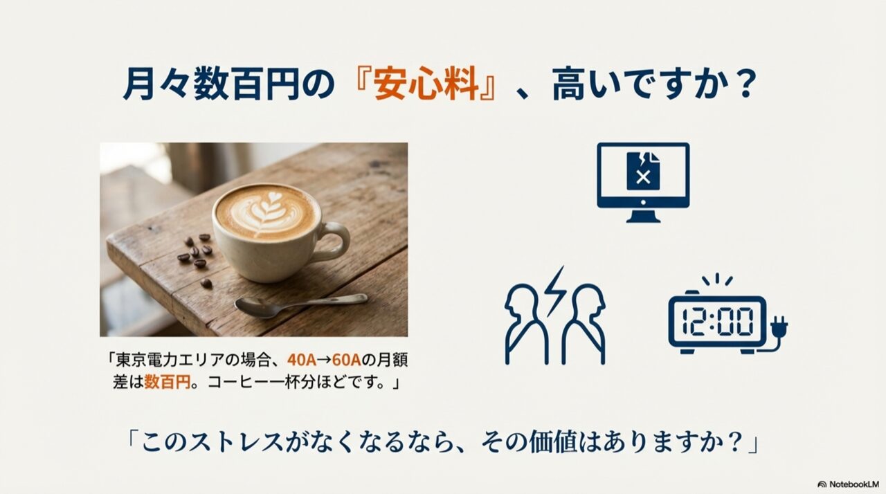 ドライヤーを使うたびに「テレビ消して!」「レンジ止めて!」と家族に叫んだり、パソコンで作業中に突然プツンと切れてデータが飛んだりするリスクを考えれば、60Aに上げてしまうのが精神衛生上もおすすめです。