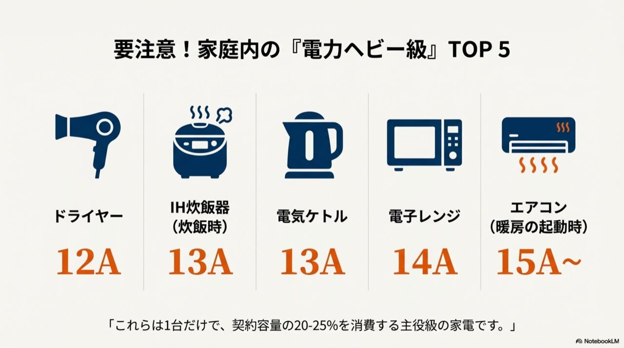 ドライヤー、IH炊飯器、電気ケトル、電子レンジ、エアコンなどの高負荷家電のイラストと、それぞれの消費電流目安(12A〜15Aなど)。