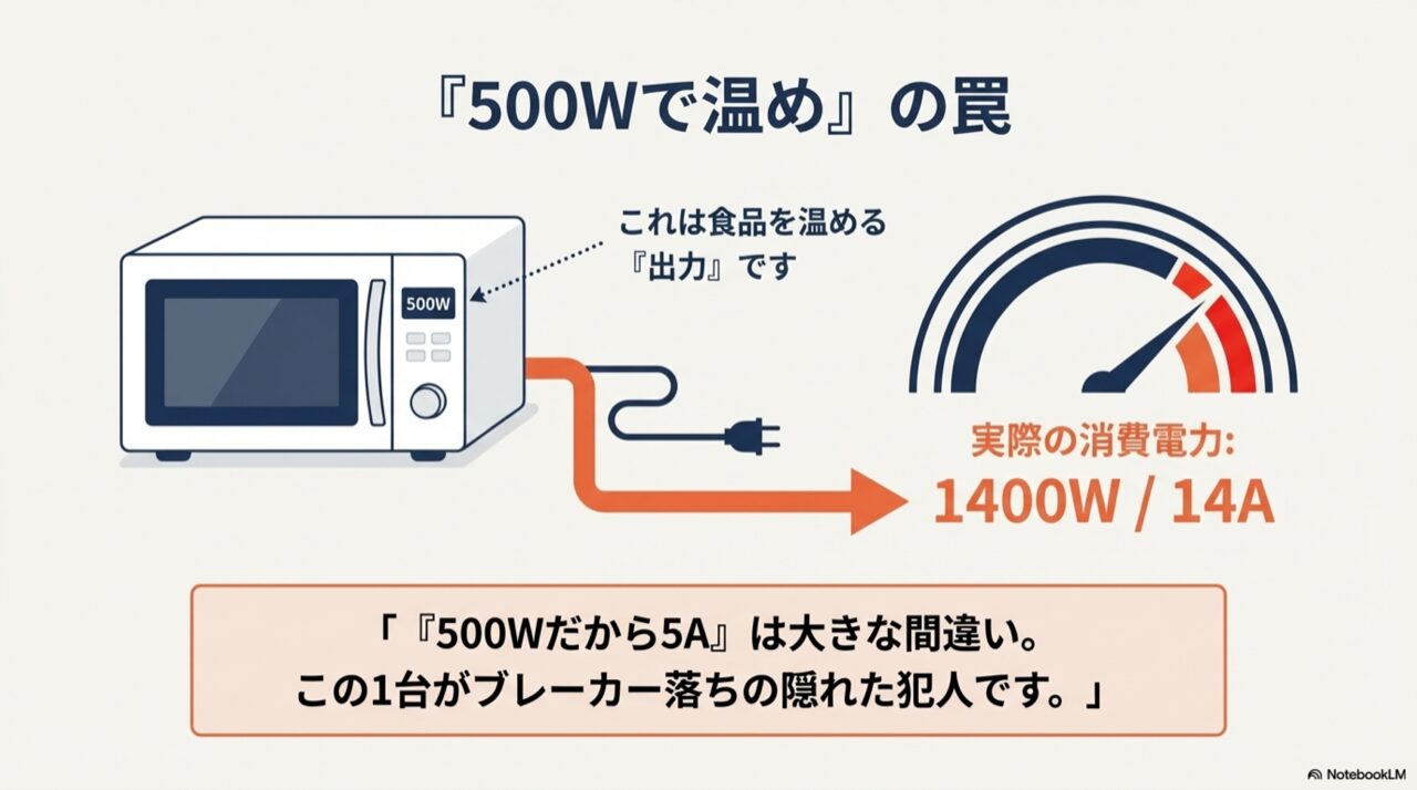 電子レンジの500W設定はあくまで温める出力であり、実際の消費電力は1400W(14A)近くになることを解説した図。