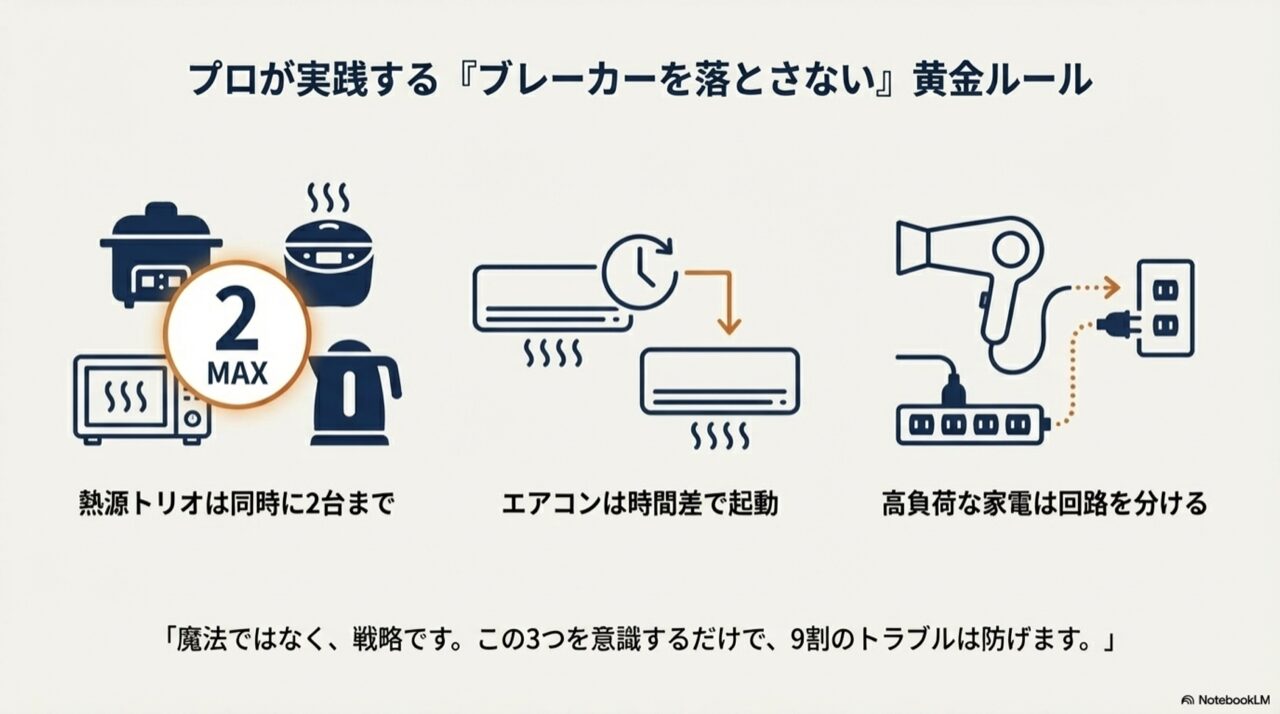 ここを正しく理解し、家電を使うタイミングをほんの少し工夫するだけで、ブレーカーが落ちるトラブルを驚くほど減らせるようになりますよ。