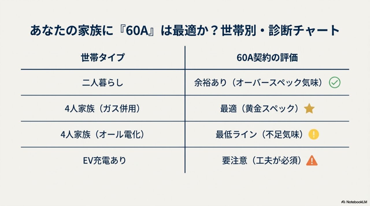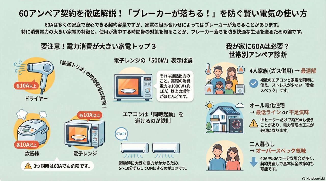 こうした変化があっても、60A契約であれば対応できるケースがほとんどです。「誰かが我慢する」というストレスを感じずに生活できるギリギリのラインではなく、ある程度の「無茶」が効くライン、それが60Aだと思ってください。