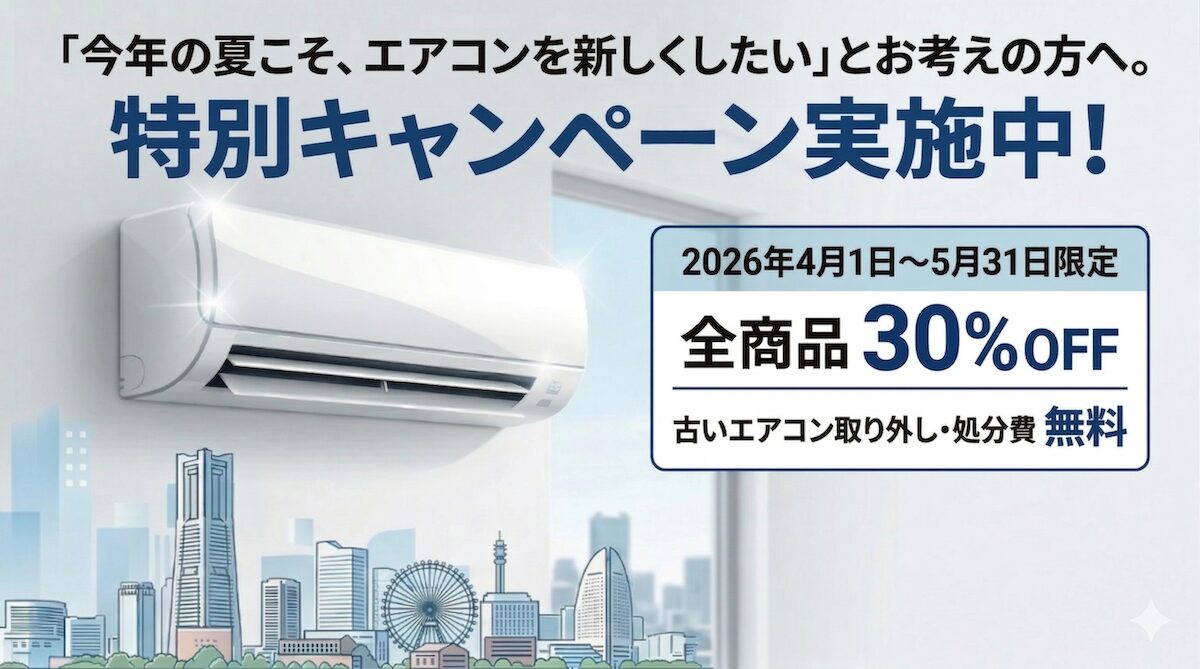 期間中は全商品30%OFFに加え、面倒な古いエアコンの取り外し・処分費も完全無料。初期費用を大きく抑えて交換できる大チャンスです。