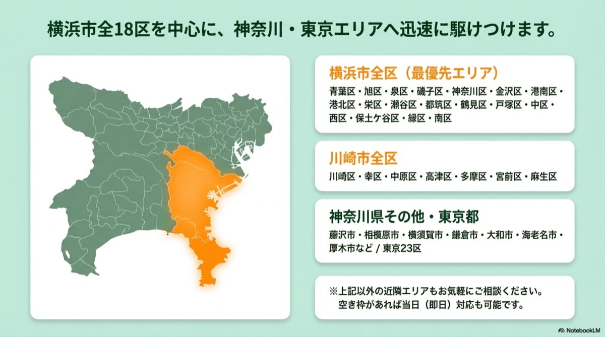 横浜市全区(青葉区・旭区・泉区・磯子区・神奈川区・金沢区・港南区・港北区・栄区・瀬谷区・都筑区・鶴見区・戸塚区・中区・西区・保土ケ谷区・緑区・南区)、川崎市全区(川崎区・幸区・中原区・高津区・多摩区・宮前区・麻生区)、藤沢市・相模原市・横須賀市・鎌倉市・逗子市・茅ヶ崎市・平塚市・大和市・座間市・海老名市・厚木市・秦野市・小田原市、東京23区