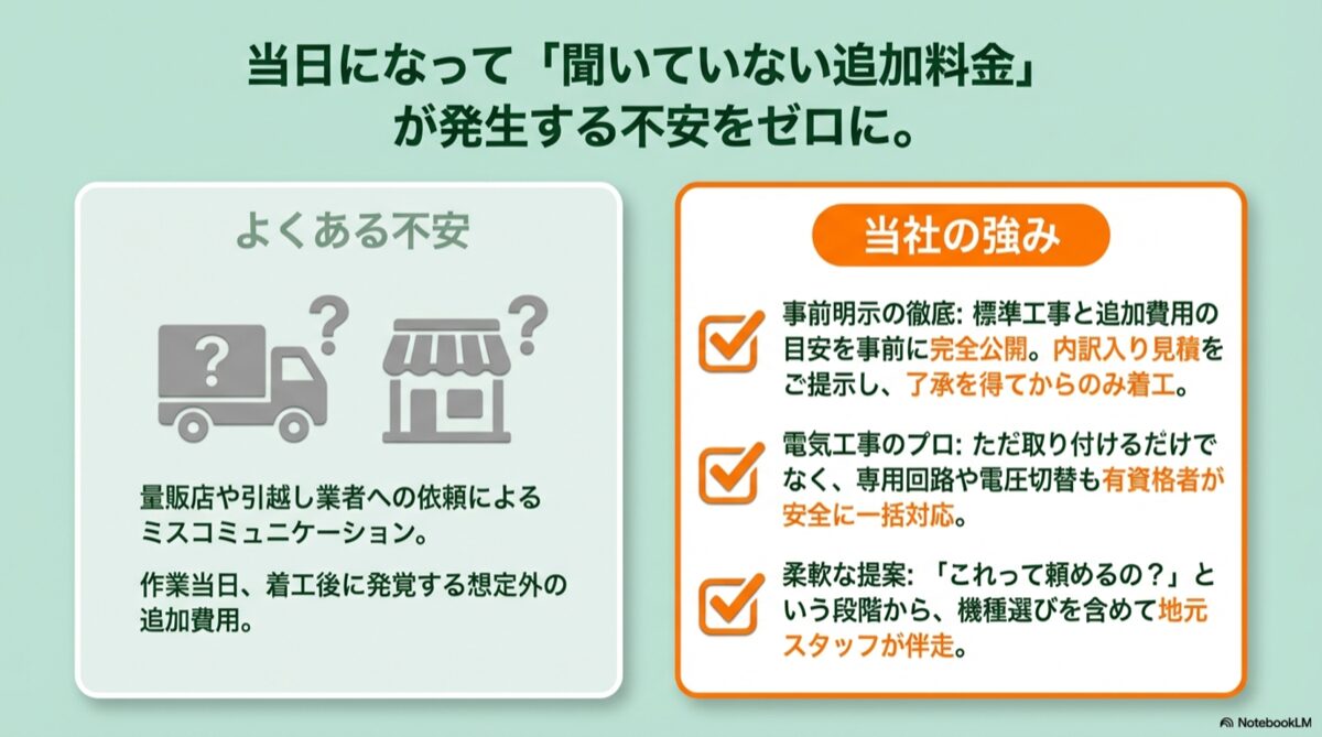 金額面で不安を感じさせないよう、標準工事に含まれる作業範囲と追加費用の目安を事前に明示しています。