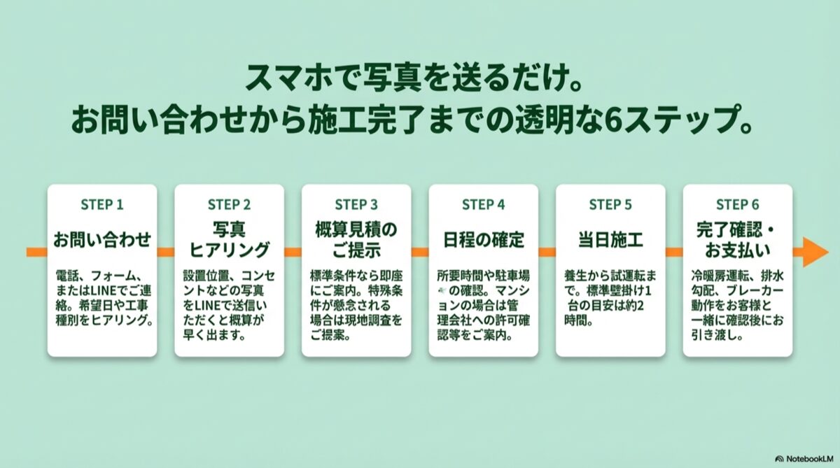 養生→室内機据付→配管接続→真空引き→試運転の順で進めます。標準1台の目安は約2時間です(難工事や複数台は延びます)。
